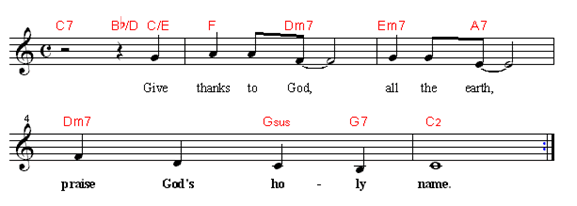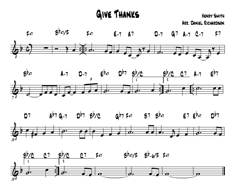 Sometimes new songs need freshening too. Here is the contemporary favorite “Give Thanks,” arranged here by Daniel Richardson in a simple jazz style. An ensemble with even modest chops can pull this off gracefully. Use a bass for the lowest line (derived from the chord chart), and a soprano instrument on the melody.
